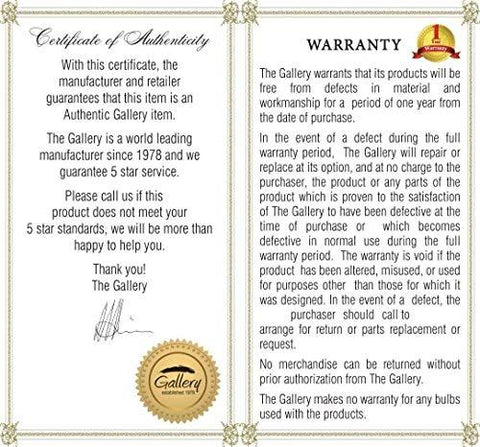 1. Each item comes with a Certificate of Authenticity, certifying this product is an authentic Gallery lighting fixture.